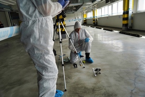 • Technik w kombinezonie w trakcie robienia zdjęć.