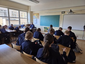 Jedno z takich spotkań odbyło się wczoraj (20.10.2025) w Zespole Szkół Akademickich we Włocławku. Zastępca Komendanta Miejskiego Policji we Włocławku nadkom. Tomasz Wende podczas zajęć przekazał uczniom jakie panują w służbach mundurowych zasady oddawania honoru i meldunków.