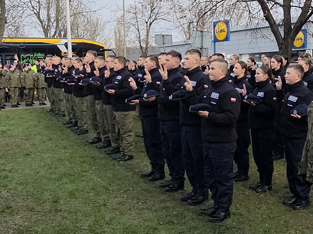 Licealiści rozpoczynający naukę w klasie mundurowej o profilu policyjnym i straży granicznej dzisiaj (21.11.2025) w obecności szkolnego sztandaru i zaproszonych gości złożyli ślubowanie, że będą dbali o honor młodego pokolenia, dobre imię szkoły i należycie wypełniali swoje obowiązki.