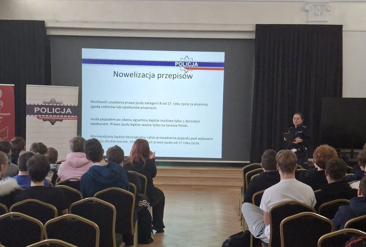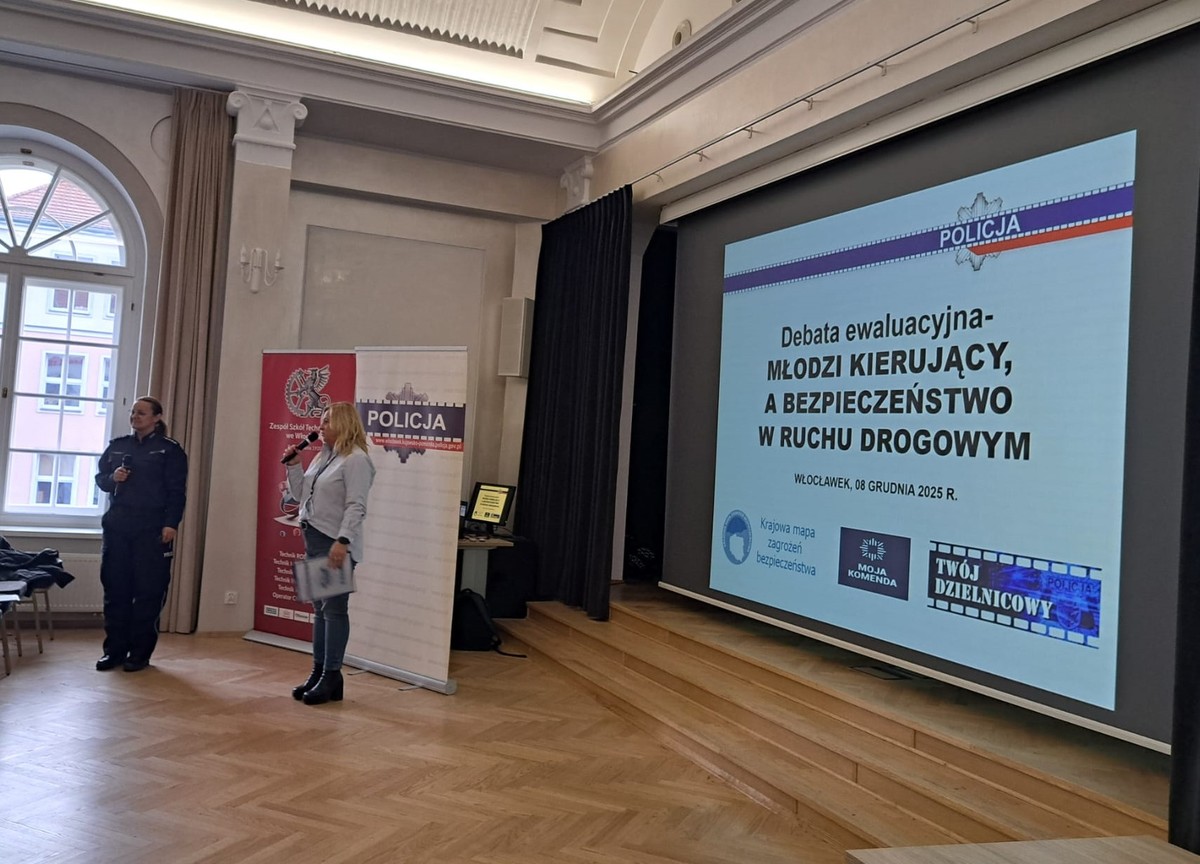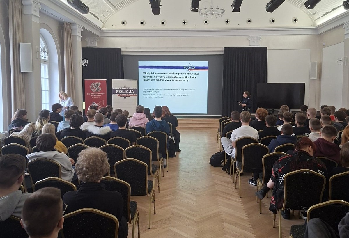 W poniedziałek, 8 grudnia 2025 r., w Zespole Szkół Technicznych we Włocławku odbyło się spotkanie poświęcone bezpieczeństwu młodych kierowców, zorganizowane przez Komendę Miejską Policji we Włocławku we współpracy z gronem pedagogicznym szkoły.